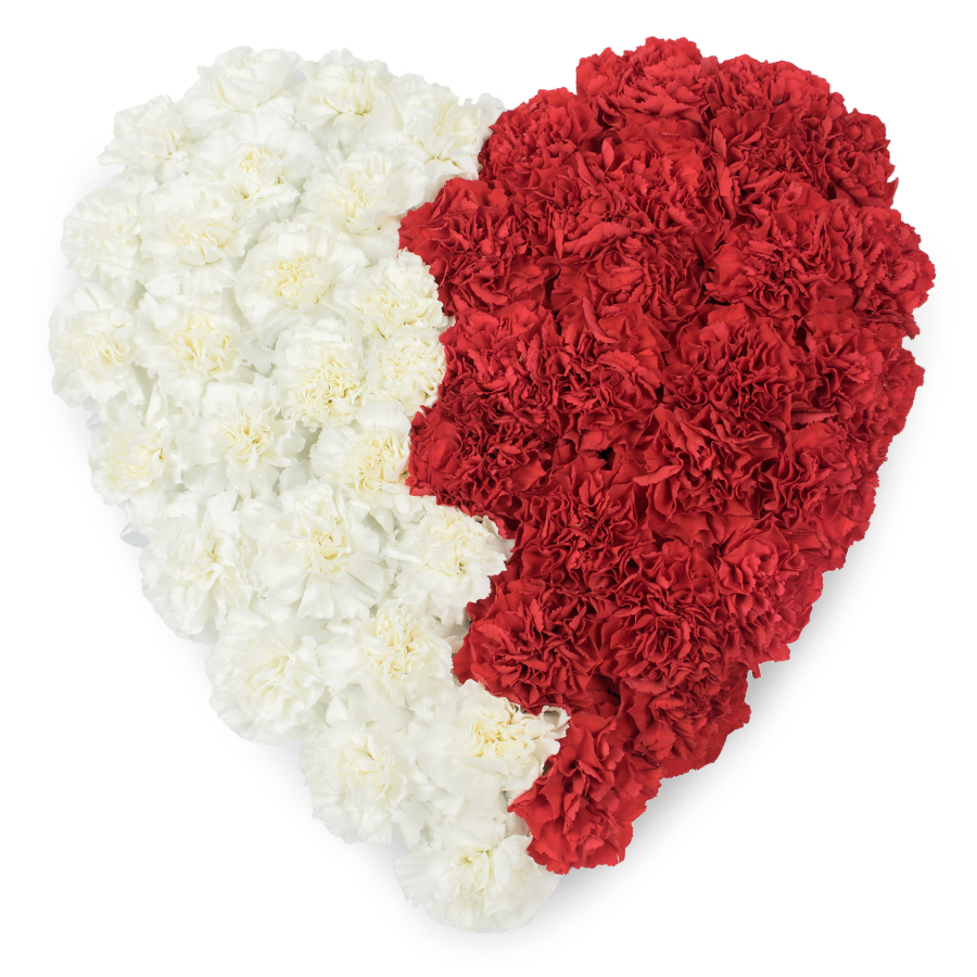 Discover the exquisite craftsmanship of our Mixed Carnations Heart Arrangement, expertly assembled by Handy Flowers. This striking bouquet features a harmonious blend of pure white and vivid red carnations, forming a heart shape that symbolizes love and compassion—ideal for expressing sympathy or affection.